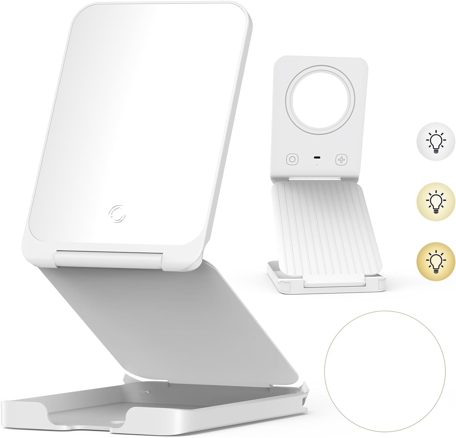 - 【 Rechargeable Travel Makeup Mirror 】-Built-in 1000mAh rechargeable battery, which can continue to work for 100 minutes after being fully charged. Can be charged at any time via a laptop, power bank, or charger. The cosmetic mirror is made of high-quality ABS and glass, the folding design can better protect the mirror from breakage, is more durable than ordinary plastic mirrors, and can be used as a desktop mirror or for daily travel use
